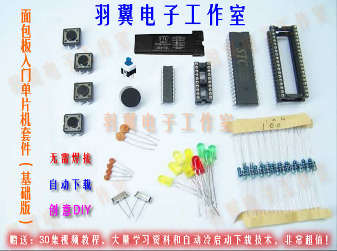 [视频] 用面包板入门单片机(第1集) ----------------------- 用面包板学习单片机是开放式的,更容易快速搭建电路和实验。学习的全过程不需要焊接,不受硬件和软件的局限。羽翼电子工作室为用面包板入门单片机专门制作了套件和系列教学视频。还有更多新奇的趣味实验在里面,带给你单片机入门的全新风格。